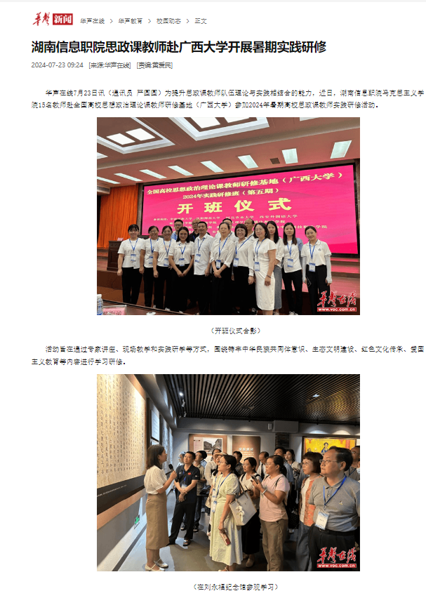 7月23日,华声在线发布《湖南信息职院思政课教师赴广西大学开展暑期实践研修》