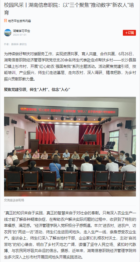 7月1日,学习强国发布《湖南信息职院:以“三个聚焦”推动数字“新农人”培育》