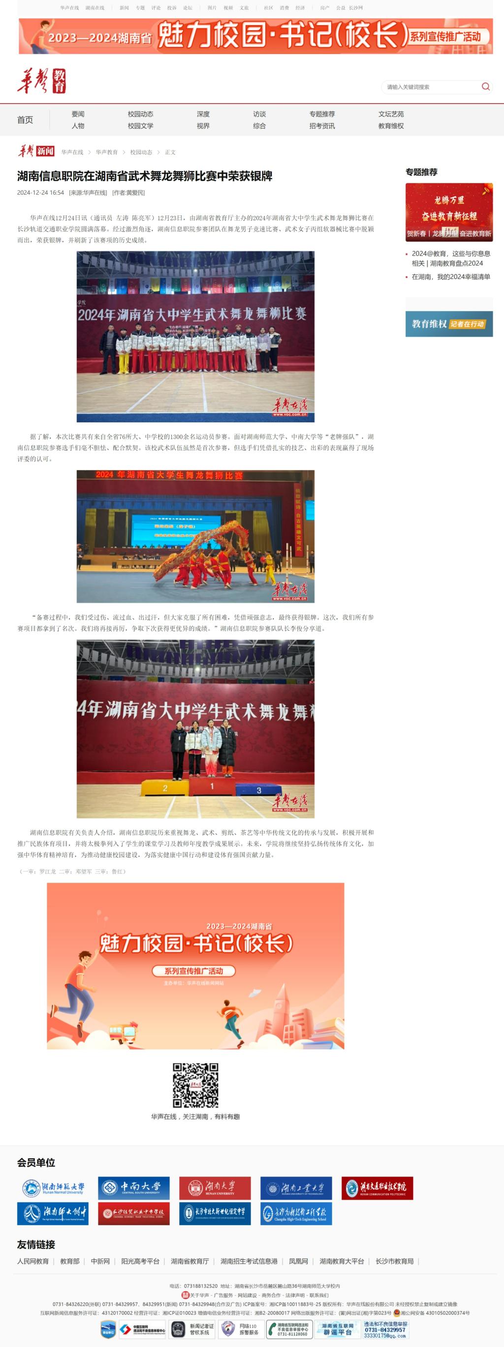 12月24日,华声在线发布《湖南信息职院在湖南省武术舞龙舞狮比赛中荣获银牌》