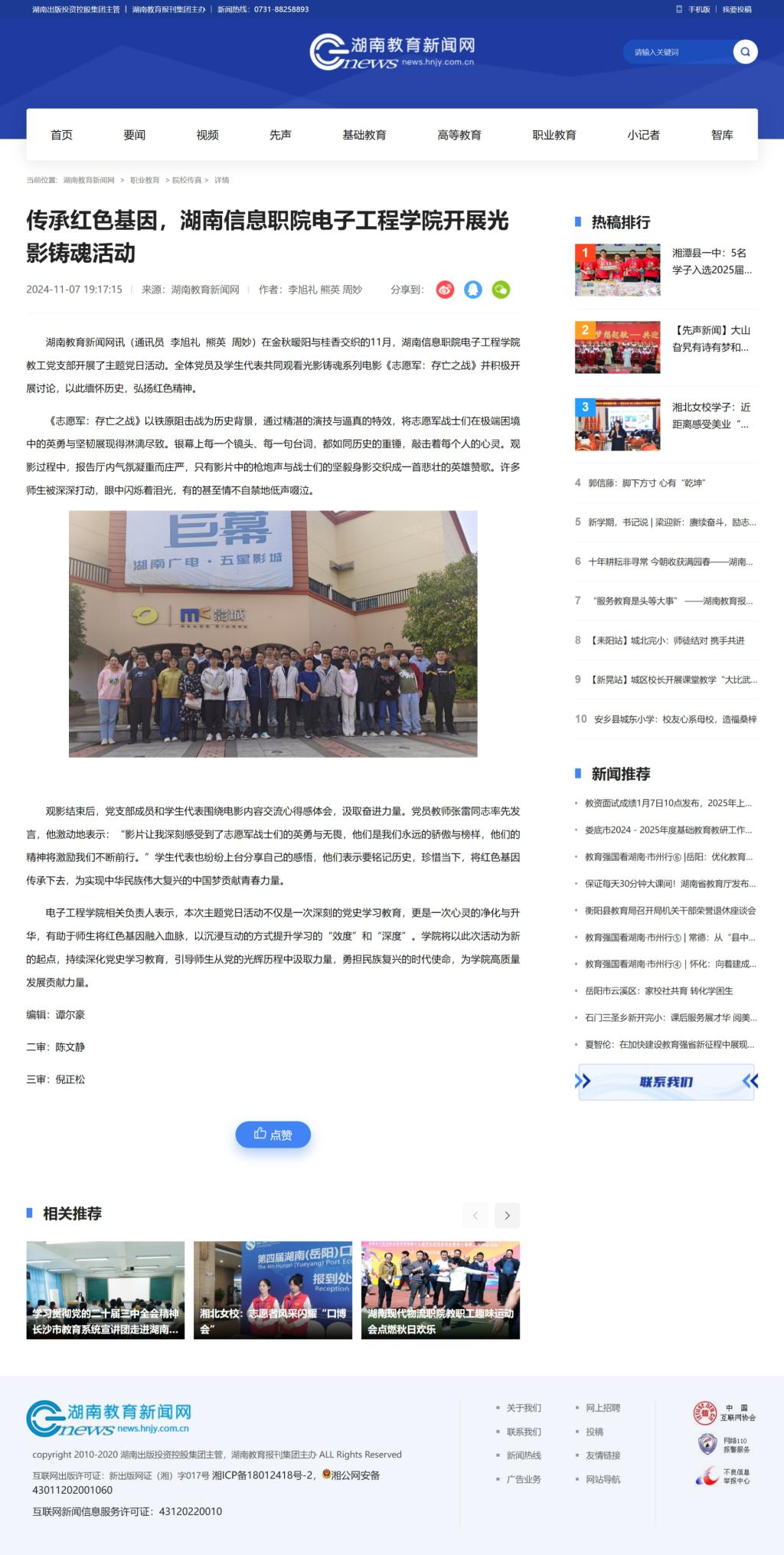 11月7日,湖南教育新闻网发布《传承红色基因,湖南信息职院电子工程学院开展光影铸魂活动》
