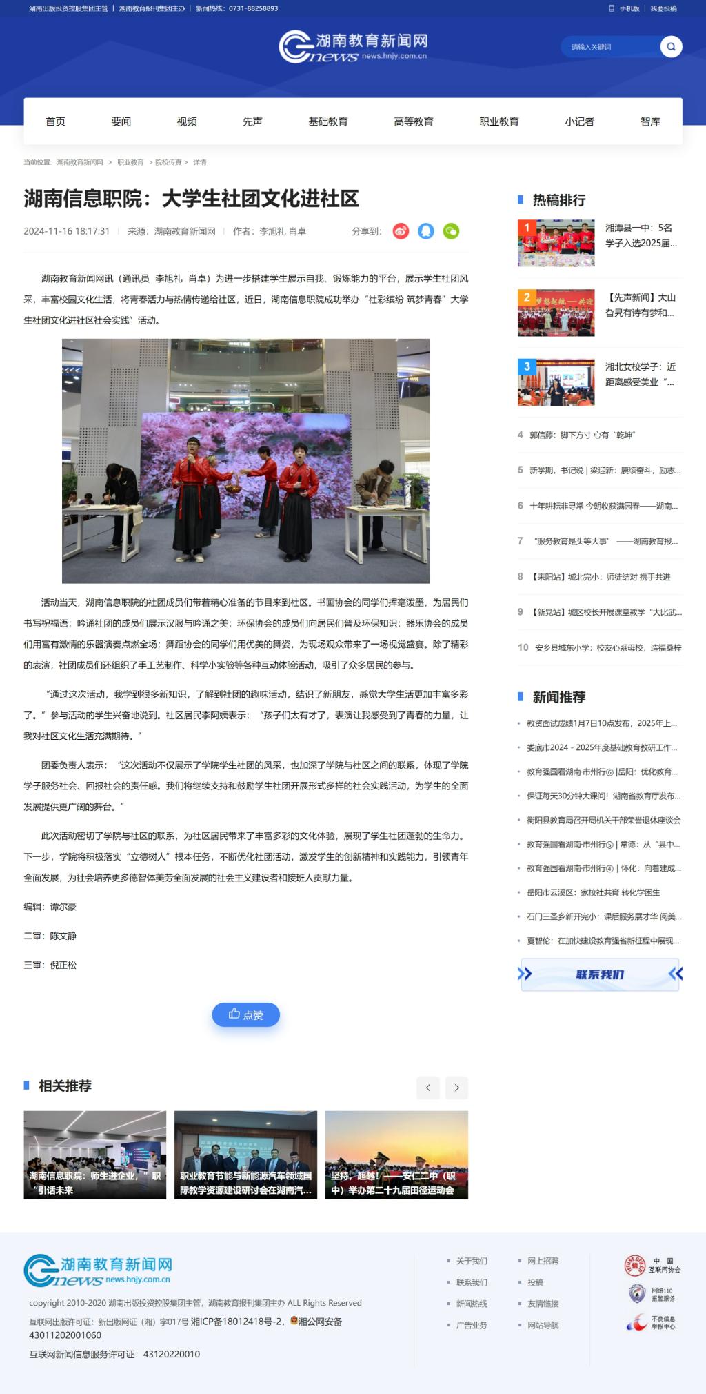 11月16日,湖南教育新闻网发布《湖南信息职院:大学生社团文化进社区》