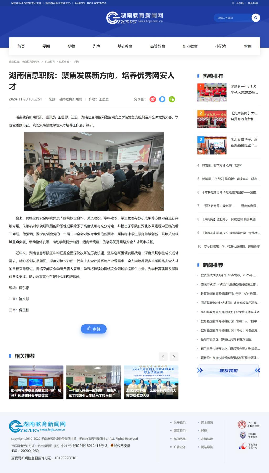 11月20日,湖南教育新闻网发布《湖南信息职院:聚焦发展新方向,培养优秀网安人才》