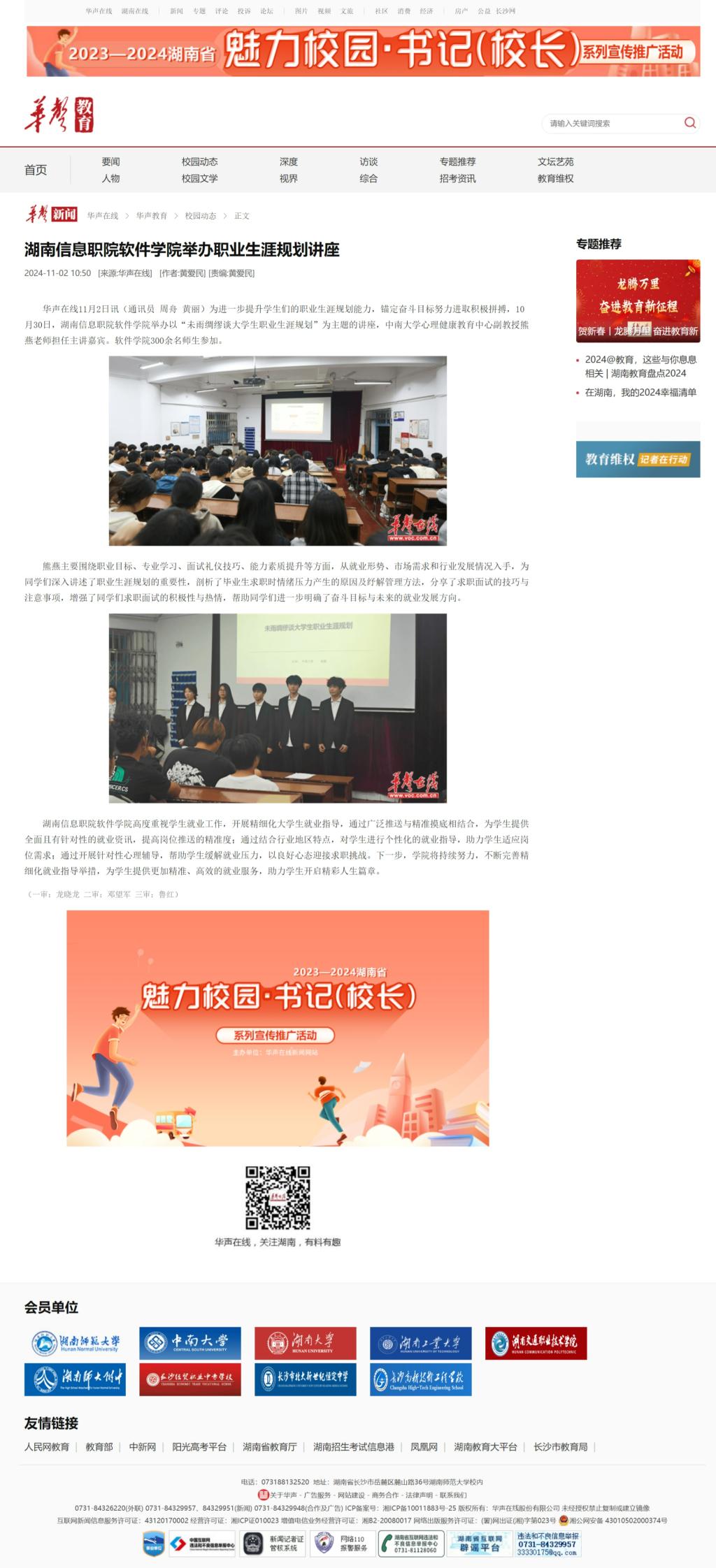 11月2日,华声在线发布《湖南信息职院软件学院举办职业生涯规划讲座》