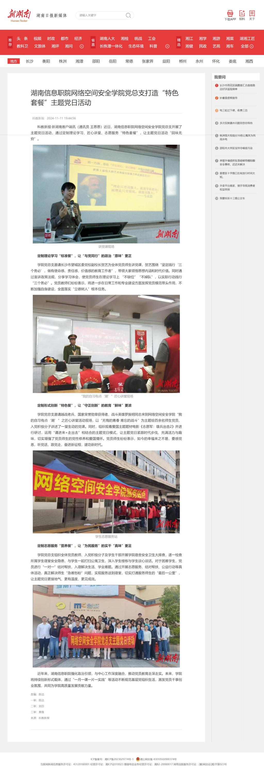 11月11日,新湖南发布《湖南信息职院网络空间安全学院党总支打造“特色套餐”主题党日活动》