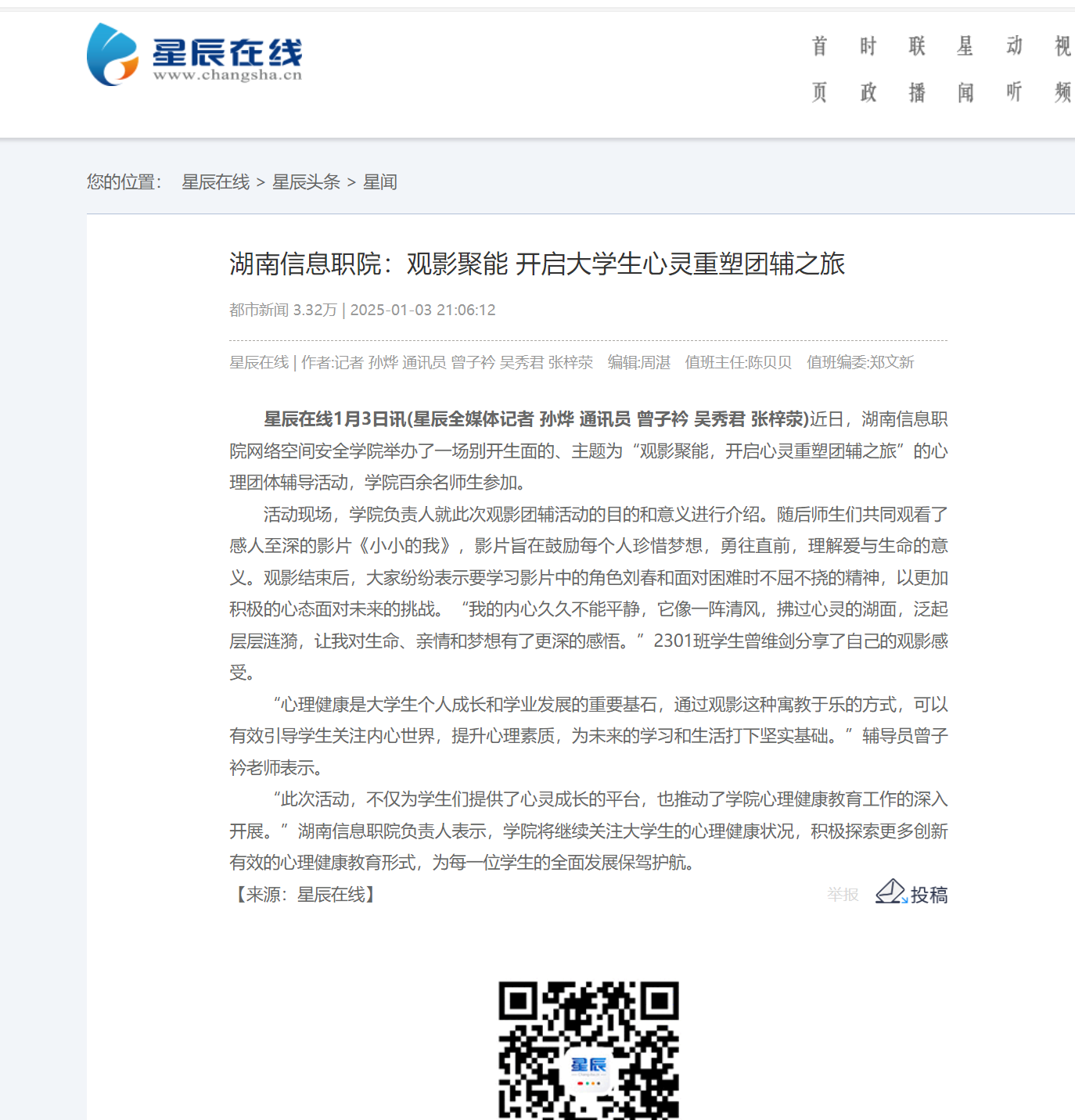 1月3日,星辰在线发布《湖南信息职院:观影聚能 开启大学生心灵重塑团辅之旅》。