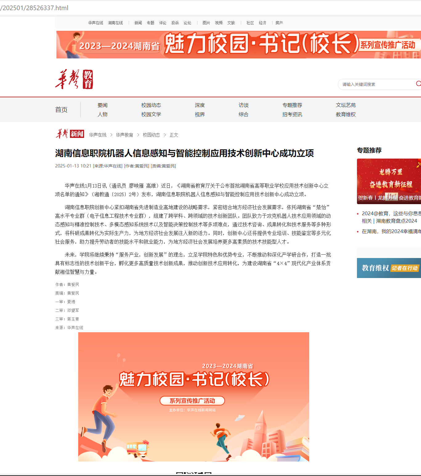 1月13日,华声在线发布《湖南信息职院机器人信息感知与智能控制应用技术创新中心成功立项》