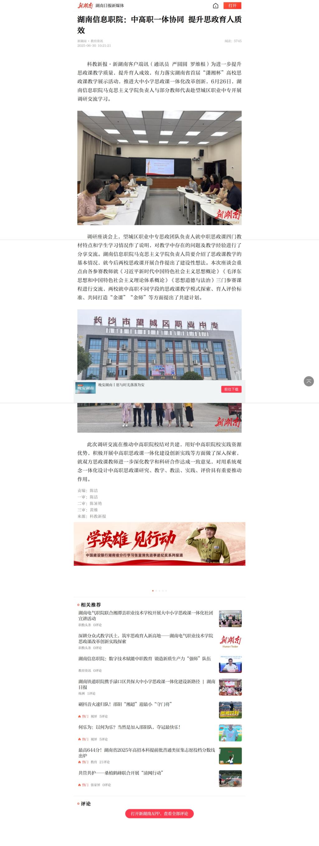6月30日,新湖南发布《湖南信息职院:中高职一体协同 提升思政育人质效》