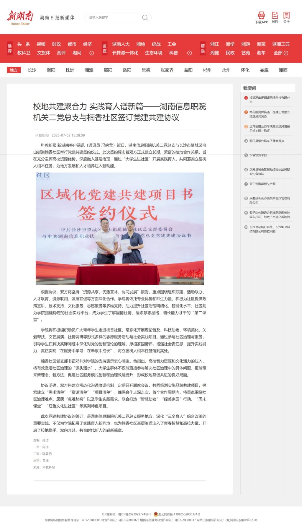 7月2日,新湖南发布《校地共建聚合力 实践育人谱新篇——湖南信息职院机关二党总支与楠香社区签订党建共建协议》