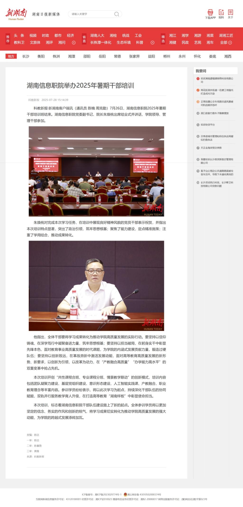 7月28日,新湖南发布《湖南信息职院举办2025年暑期干部培训》