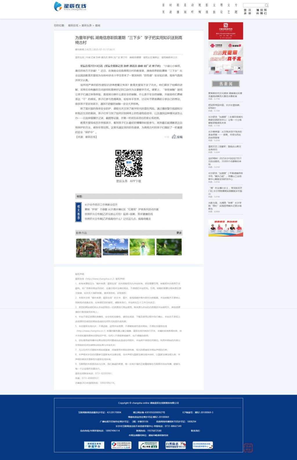 7月13日,星辰在线发布《为童年护航 湖南信息职院暑期“三下乡”学子把实用知识送到高椅古村》