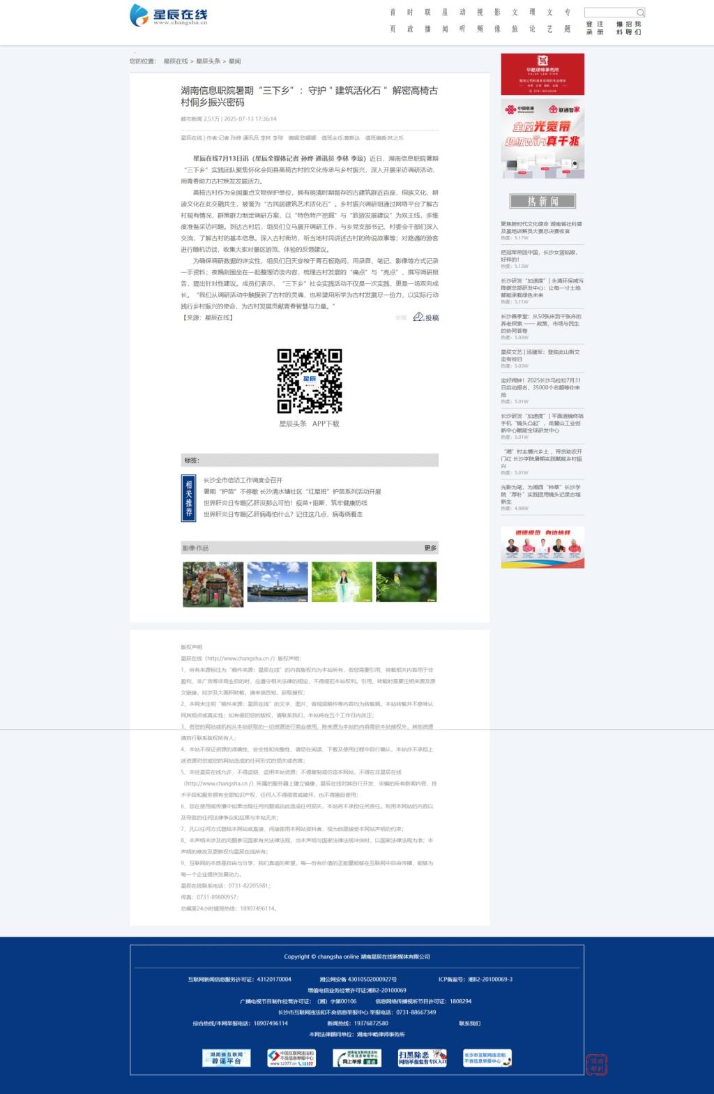 7月13日,星辰在线发布《湖南信息职院暑期“三下乡”:守护"建筑活化石" 解密高椅古村侗乡振兴密码》
