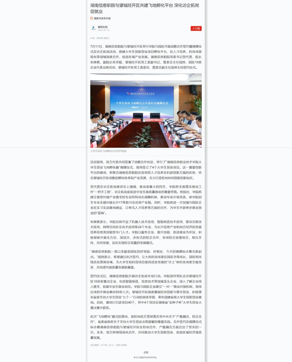 7月16日,学习强国发布《湖南信息职院与望城经开区共建飞地孵化平台 深化访企拓岗促就业》