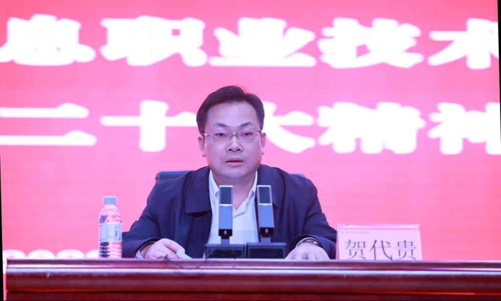 贺代贵从关于党的二十大的主题、主要成果、关于过去5年的工作和新时代10年的伟大变革、关于马克思主义中国化时代化、关于中国式现代化、关于全面建设社会主义现代化国家的目标任务、关于坚持党的全面领导和全面从严治党、关于应对风险挑战等七个方面成果,对党的二十大精神进行了系统阐述,梳理了党的二十大报告中关于教育工作的重要论述、部署。深刻分析了党的二十大关于“实施科教兴国战略,强化现代化建设人才支撑”的战略部署,深刻阐明了如何提升教育适应性服务区域经济能力,统筹职业教育、高等教育、继续教育协同创新,推进职普融通、产教融合、科教融汇,优化职业教育类型定位。