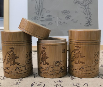 作品采用CO2激光打标机在竹木笔筒上激光雕刻各种样式的文字与图案,使其变得有特色与个性化,廉洁笔筒周身以莲花为鉴,以清廉为魂,彰显廉洁精神,营造清正廉洁的文化氛围。