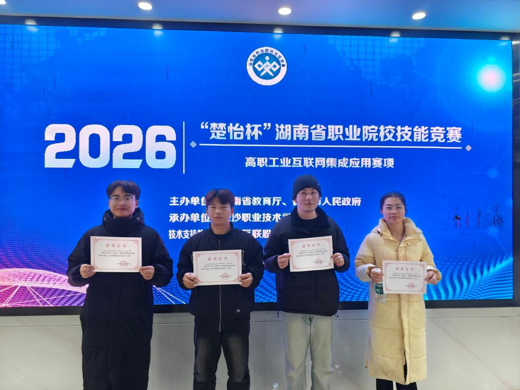 近日,2026年“楚怡杯”湖南省职业院校技能竞赛工业互联网集成应用赛项圆满落幕。机电工程学院工网2401班李乐、工网2402班梁好、工网2402班唐润之、电气2401班杨恩凯4位学子凭借扎实的专业技能与稳定的赛场发挥,斩获二等奖、三等奖各一项。这是继2025年该赛项获二等奖、三等奖后,best365官网连续两年在该赛项中同时摘得两项大奖,充分展现了学院在高素质技术技能人才培养上的坚实底蕴与持续成效。