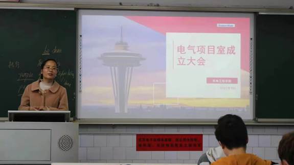 左光群副院长在致辞中代表学院向电气项目室的成立表示热烈祝贺,并且提出了三点建议。一是加强学习、提升自我;要求学生学好理论知识,强化课堂教学知识的学习。二是依托项目室、成就自我;鼓励学生依托项目室,积极参加技能竞赛、创新创业比赛,提高技能水平和创新创新素养。三是开展多项活动、提升培养质量;要求教师积极参与到项目室的建设中,积极组织多项活动,让项目室活起来、火起来。