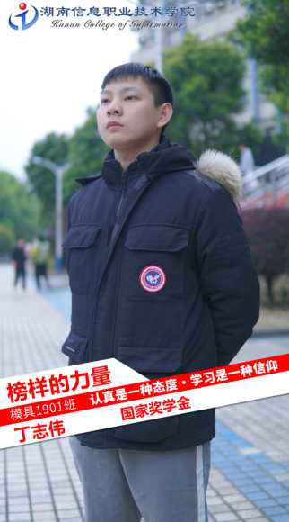 丁志伟,机电工程学院2019级模具设计与制造专业学生,汉族,湖南攸县人,预备党员。2001年2月,他出生于偏远农村低保贫困家庭,在校期间担任班长兼心理委员。他从小独立自主、懂事听话、积极热情、勤奋好学,爱好唱歌、篮球、书法、绘画等。学习之余多次积极主动参加学院及社会组织的各类志愿者活动,不断提高自身综合素质和实践能力。他自律进取,成绩优秀,时刻以一名中共党员的标准严格要求自己,立志成为新时代的优秀青年,为实现中华民族伟大复兴的中国梦贡献自己的一份力量。