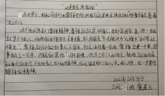 薪火永相传,最暖志愿红。雷锋精神以其崇高性、人民性、民族性、永恒性和实践性,成为新时代公民道德建设的价值引领。我们将以雷锋志愿服务为载体,引导同学们把学雷锋和志愿服务作为生活方式、生活习惯,推进学雷锋志愿服务制度化,常态化,形成向上向善的民族力量。 (作者:施祖玮)