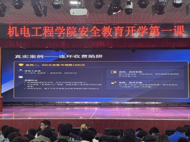 为切实筑牢校园反诈安全防线,提升学生识骗、防骗、拒骗能力,守护青年学子财产安全与青春成长,3月17日,机电工程学院在北二五楼多功能报告厅开展“守护青春,法律同行”安全教育开学第一课,以精准宣讲、以案释法的方式,为全院学生送上一堂干货满满的“反诈必修课”。