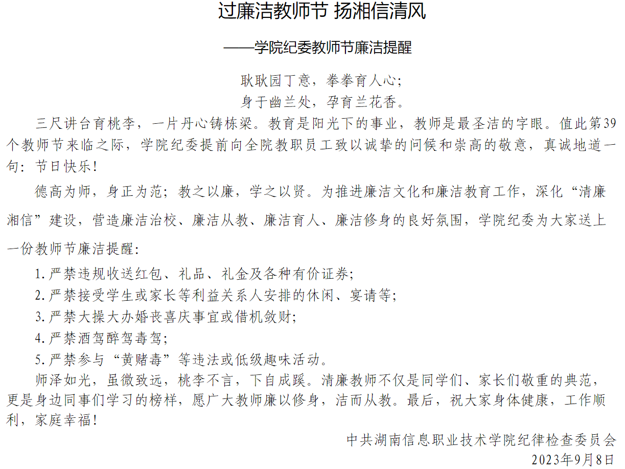 清廉过节而不失温度。教师节前,学校召开了2023年秋季教职工开学典礼暨第39个教师节表彰大会,学院纪委给全体教师送上了教师节的温馨提醒,引导教师自觉抵制违规收受学生及家长礼品礼金等不正之风,提醒教师绷紧“自律弦”,筑牢“廉洁关”。