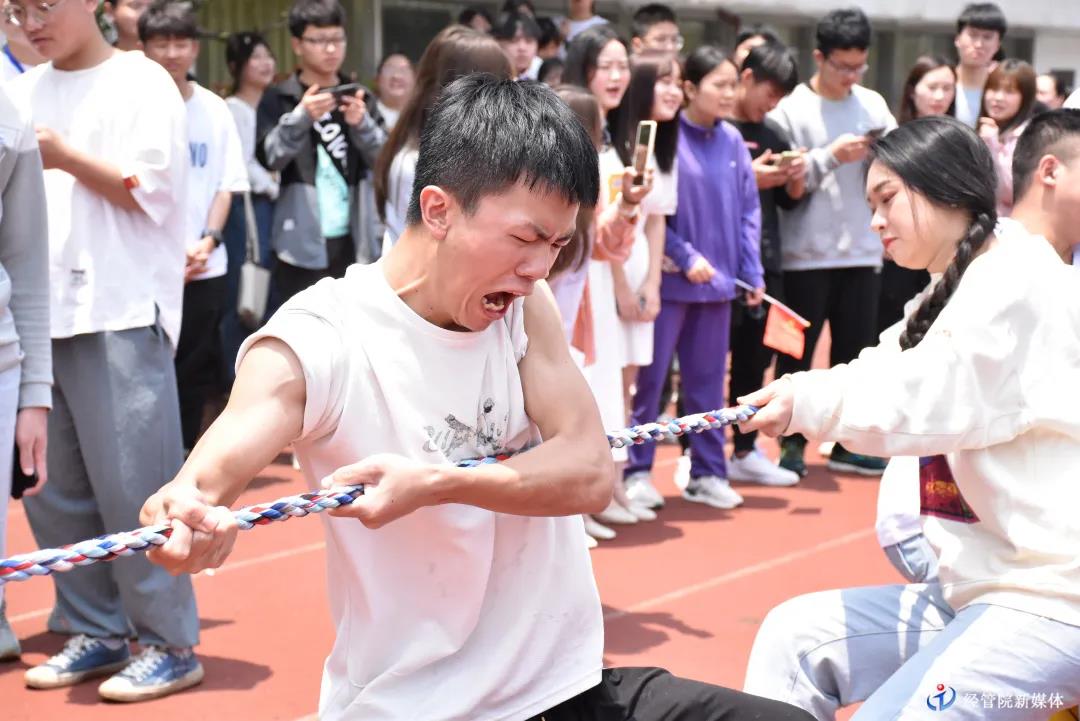 辅导员们也被现场气氛感染,带领学生们自行组织了一场趣味赛。双方势均力敌,脸都涨得面红耳赤,使尽浑身力气,围观群众叫好声不断。
