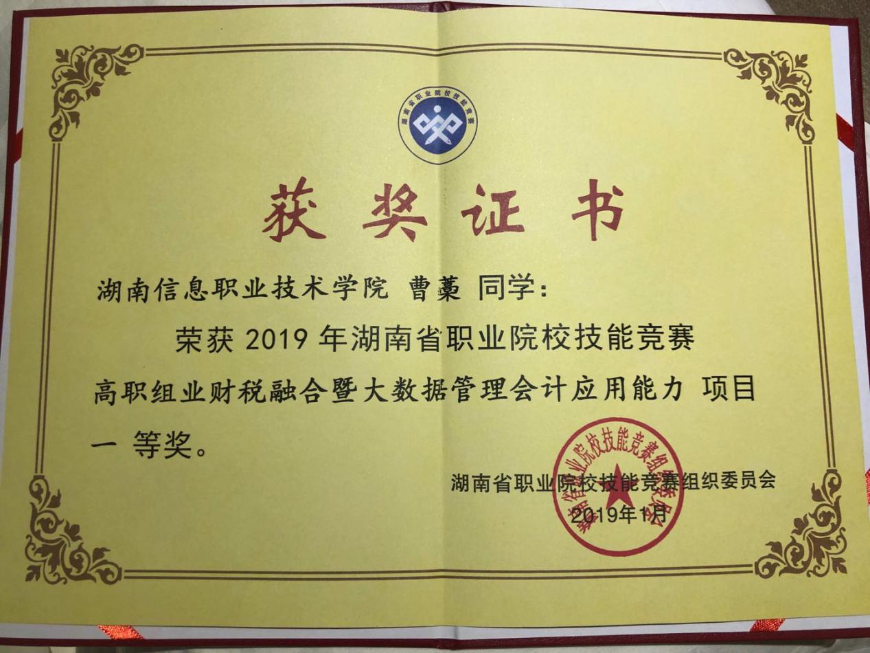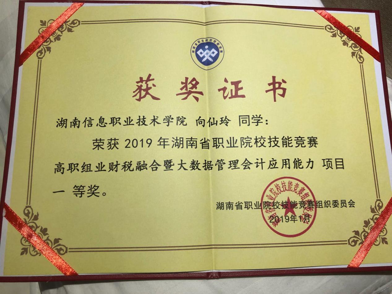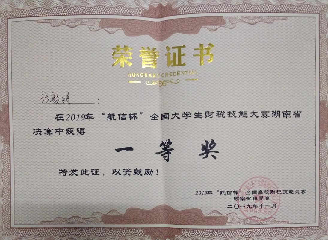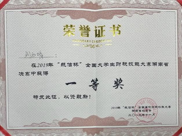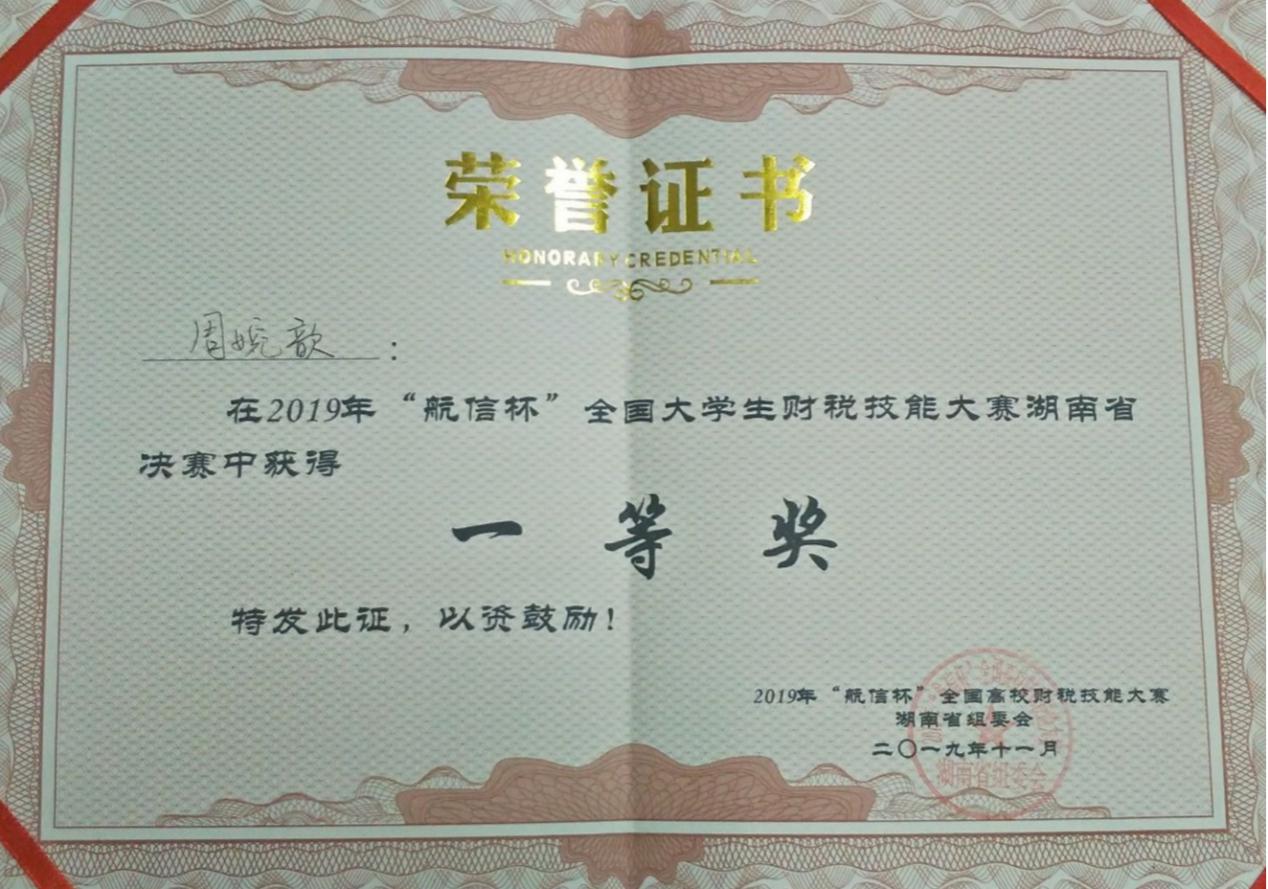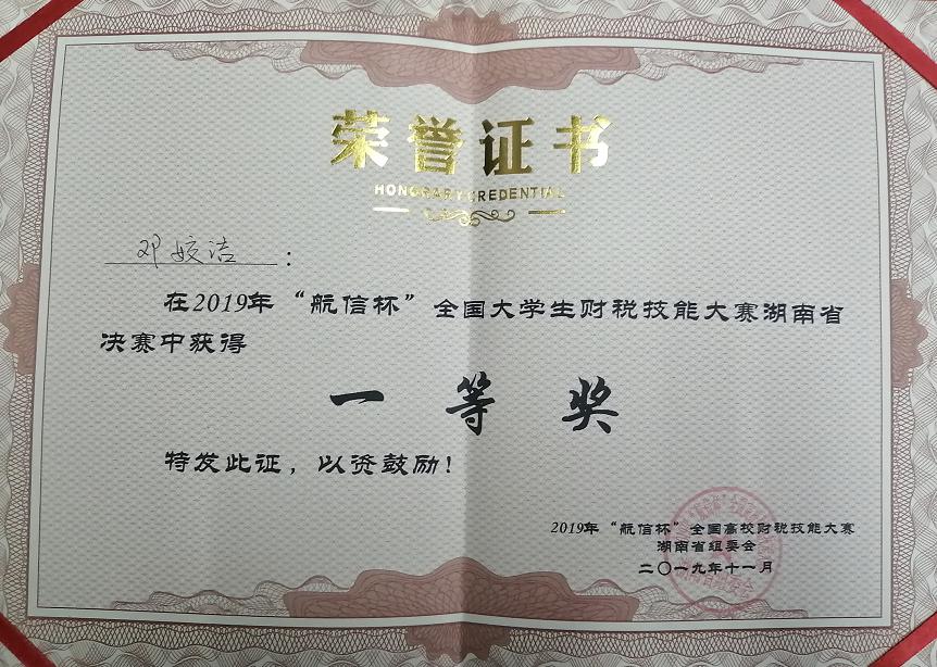 6.2019年“航信杯”全国高校财税技能大赛湖南省大赛荣获一等奖。
