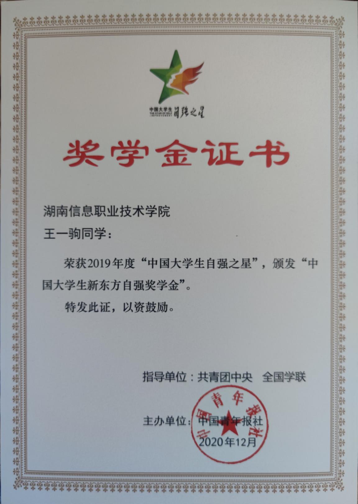 会计1803班王一驹同学由湖南省长沙市共青团推荐,已荣获2019年度“中国大学生自强之星”荣誉称号,颁发中国大学生新东方自强奖学金!