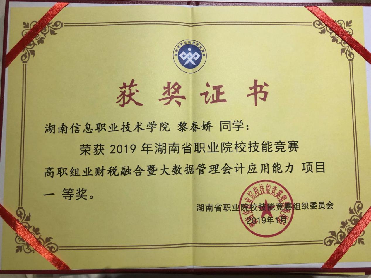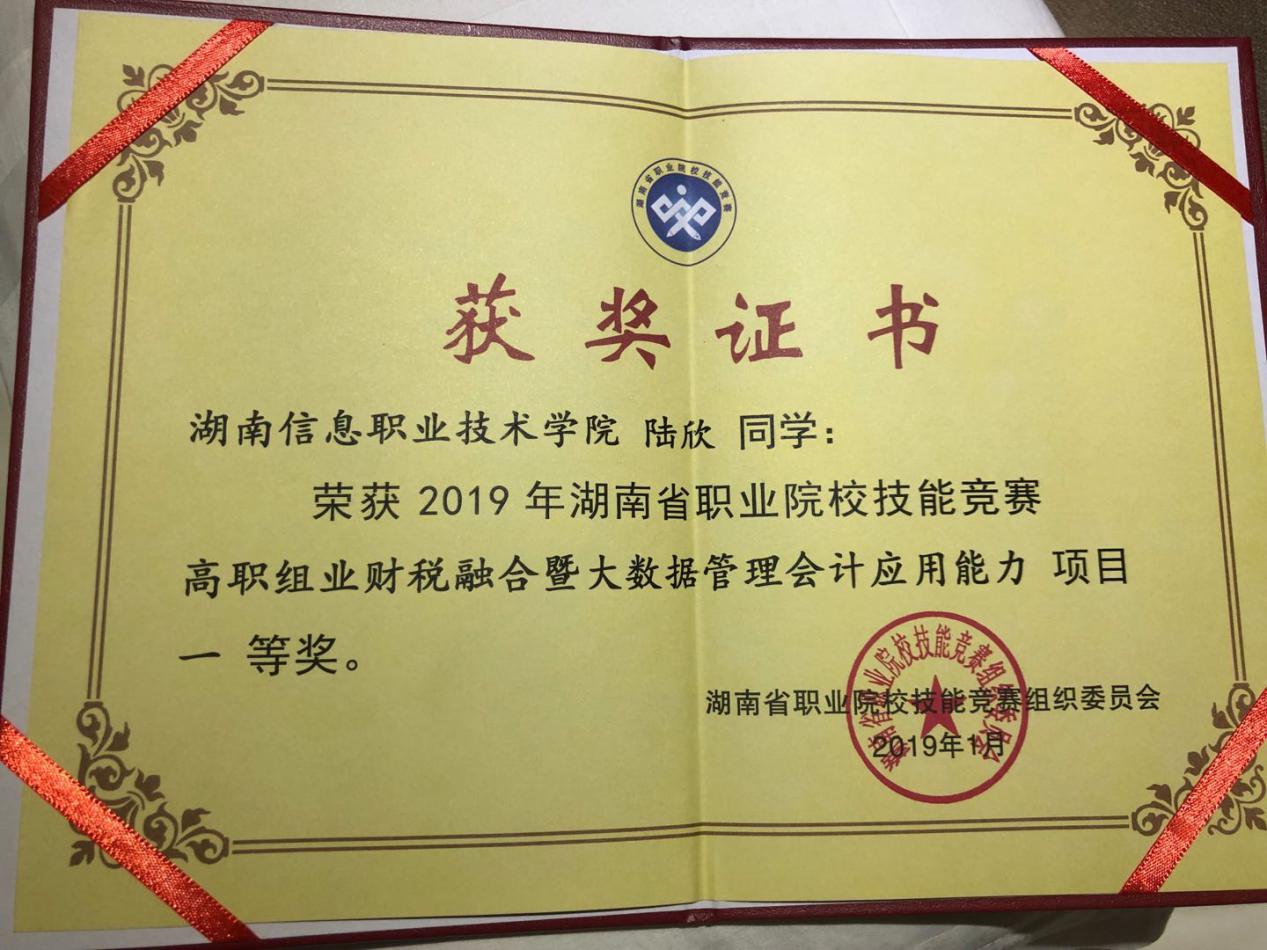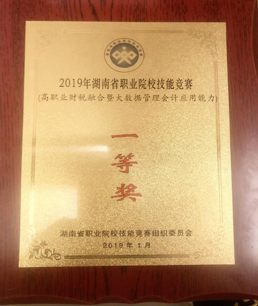 5.2019年湖南省职业院校技能竞赛业财税融合暨大数据管理会计应用能力赛项(团队赛)荣获一等奖,会计1602班向仙玲、会计1704班曹藁、会计1704班陆欣、会计1702班黎春娇。
