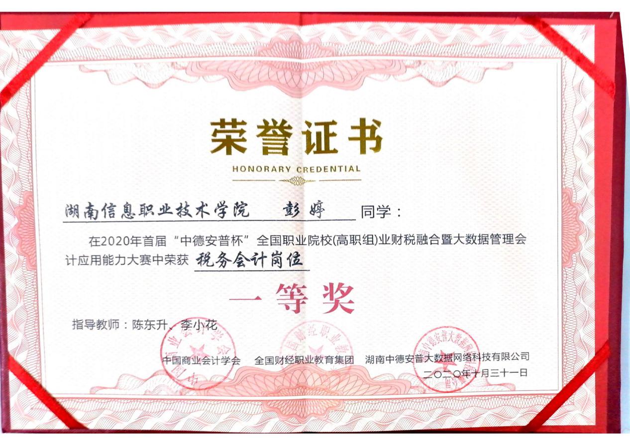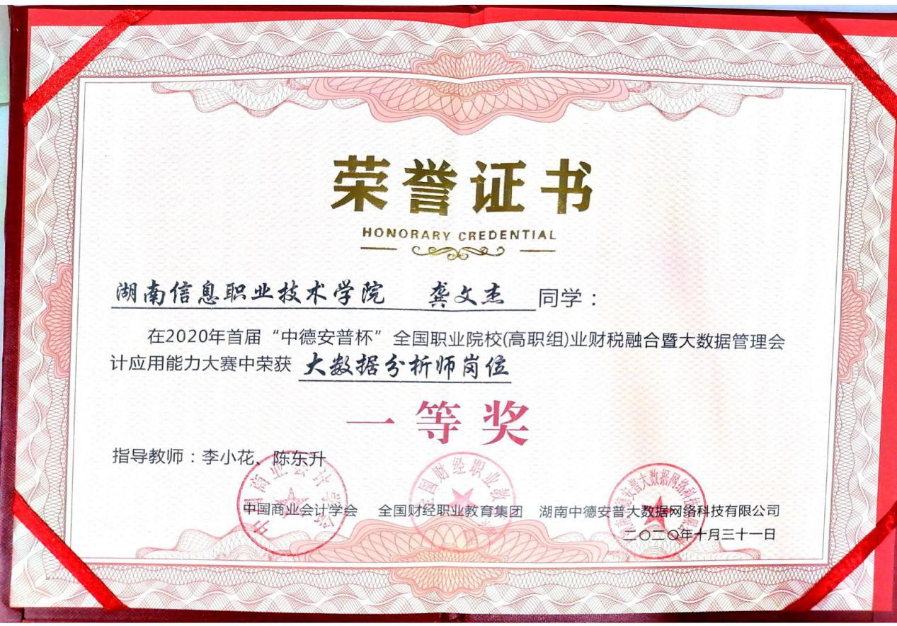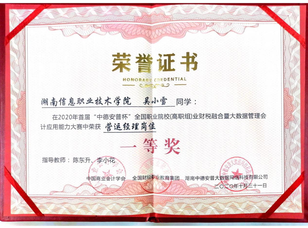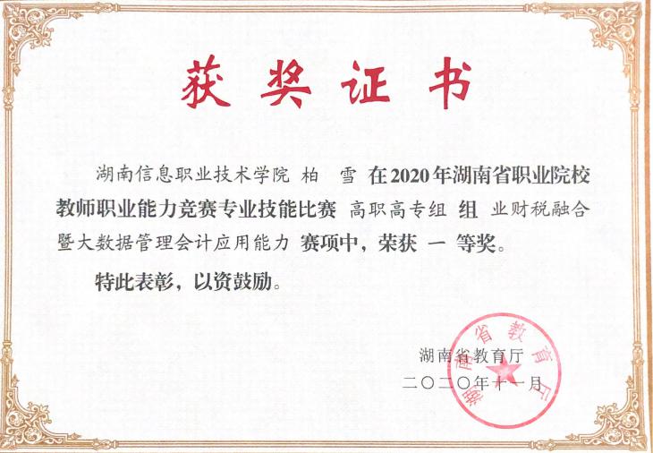 3.2020年湖南省职业院校教师职业能力竞赛专业技能比赛高职高专组业财税融合暨大数据管理会计应用能力赛项,柏雪老师荣获一等奖。