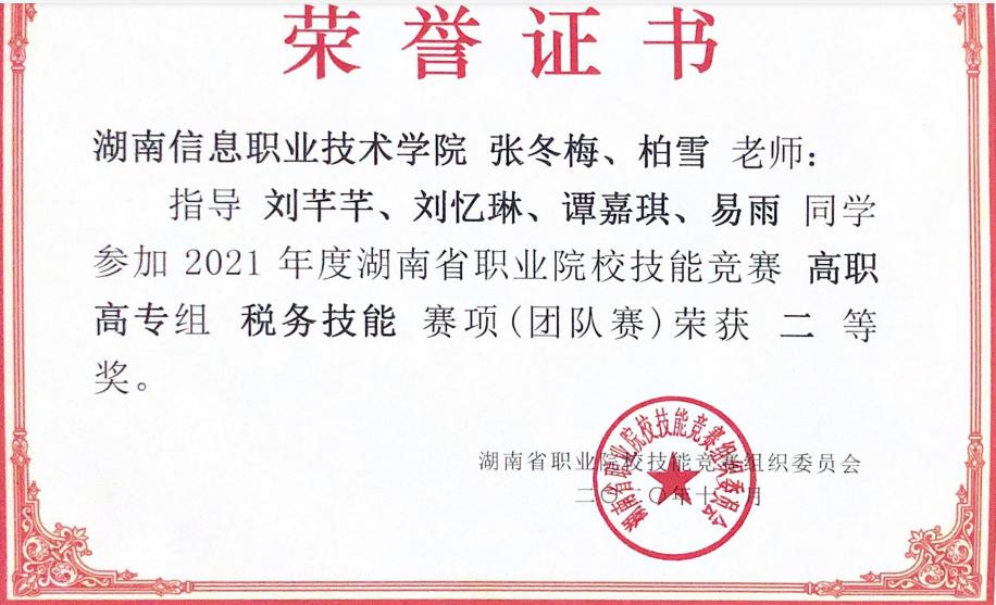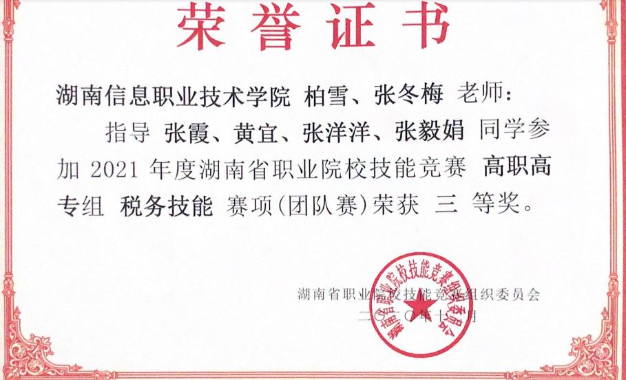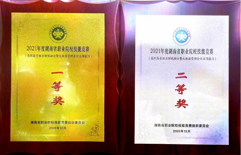 4.2021年湖南省职业院校技能竞赛高职高专组税务技能赛项(团队赛)分别荣获二等奖和三等奖。
