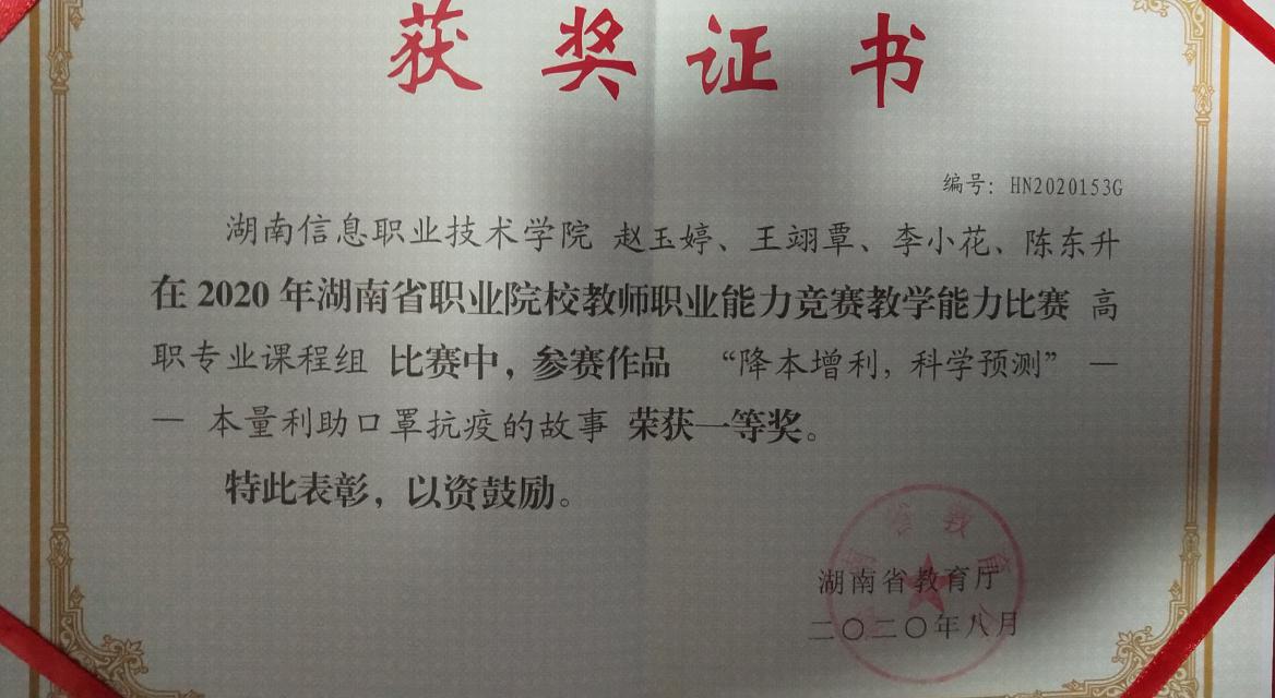 2.2020年湖南省职业院校教师职业能力竞赛教学能力比赛荣获一等奖,参赛教师:赵玉婷、王翊覃、李小花、陈东升。参赛学生18级学生。