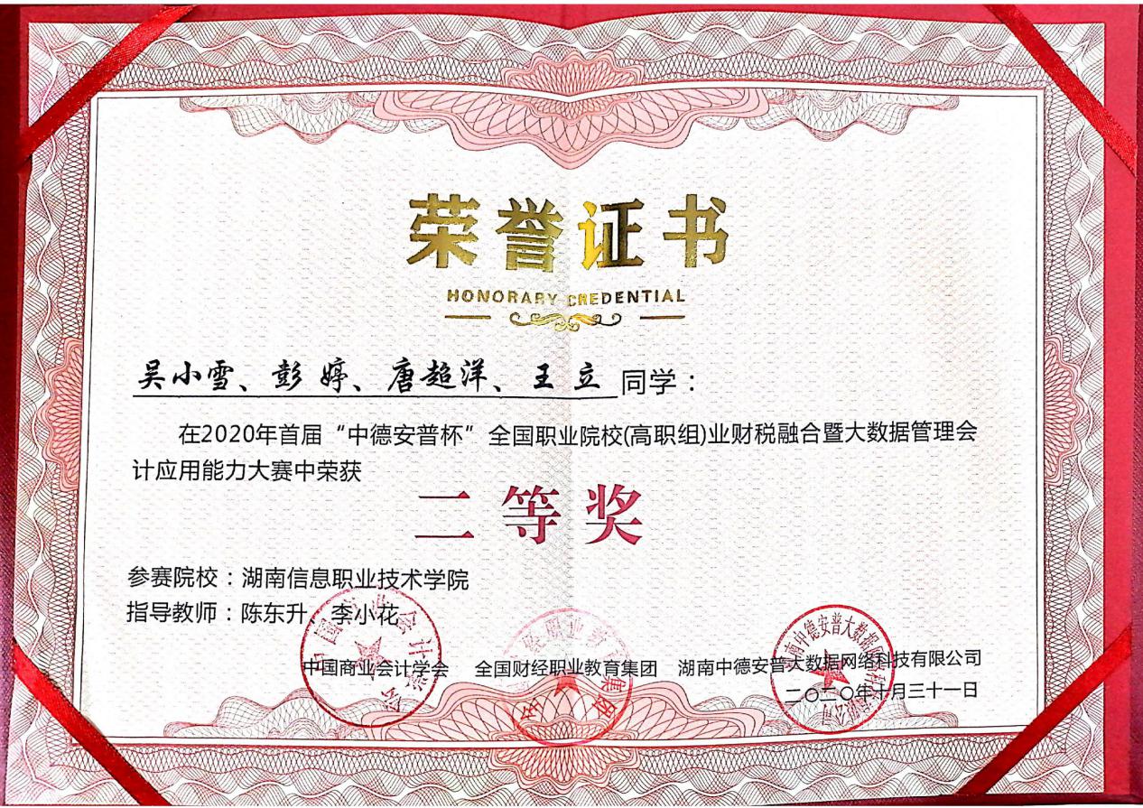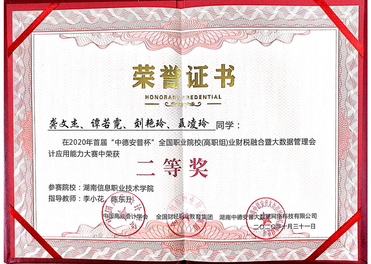 12.2020年首届“中德安普杯”全国职业院校(高职组)业财税融合暨大数据管理会计应用能力大赛(团队赛)分别荣获两个二等奖。其中吴小雪同学在营运经理岗位、彭婷同学在税务会计岗位、王立同学在财务经理岗位、龚文杰同学在大数据分析岗位中分别荣获一等奖。