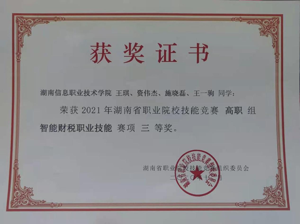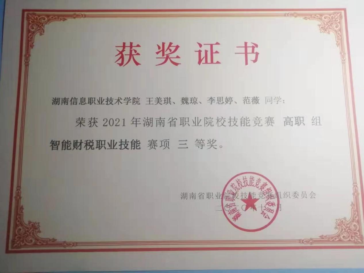 14.2021年湖南省职业院校技能竞赛高职组智能财税职业技能赛项荣获两个三等奖。