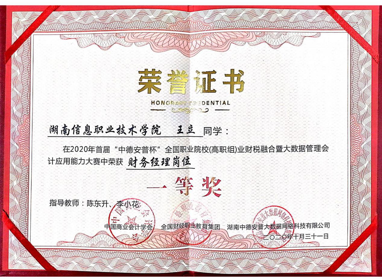 1.2021年湖南省职业院校技能竞赛业财税融合暨大数据管理会计应用能力赛项(团队赛)荣获一等奖和二等奖。一等奖会计1806班吴小雪、会计1801班唐超洋、会计1802班彭婷、会计1801班王立;二等奖会计1905班谭若霓、会计1901班龚文杰、聂凌玲、周婷。