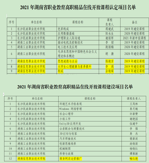 电子工程学院《电子信息工程技术专业教学资源库》入围2021年省级职业教育专业教学资源库建设项目;软件学院《移动互联网技术应用专业群教学资源库》入围2021年省级职业教育专业教学资源库拓展建设项目。陈艳芳老师负责的《思想道德与法治》、李莉老师负责的《大学生心理健康与素养提升》与余晓琛老师负责的《构成》成功入围2021年高职省级精品在线开放课程认定项目;喻红艳老师负责的《商务网店运营推广》入围2021年高职省级精品在线开放课程建设项目。