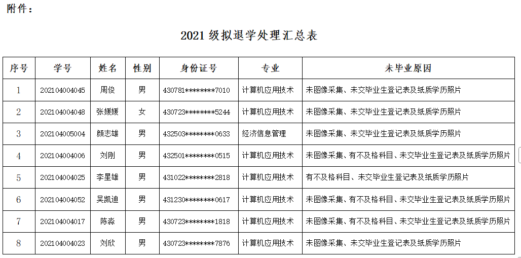 我校2021级成人教育学生共招收135人,目前还有8人未如期毕业,具体原因见下表。为进一步加强对成人高等教育在籍学生的管理,根据《普通高等学校学生管理规定》(教育部令41号)和《best365手机版官方网站成人高等学历教育学生学籍管理规定(试行)》等文件有关规定,我校拟对这8名超过最长学习年限(4.5年)未如期毕业的学生拟予以退学处理,如有特殊情况,请于2025年9月3日联系我校继续教育学院(0731-82782996 QQ:5917723),如未反馈,我们视为你已知晓此事。
