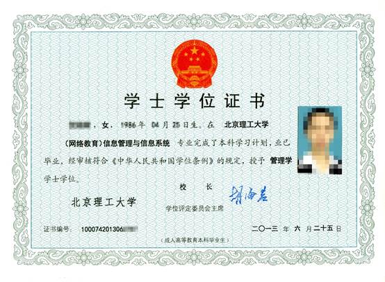 2、学位证:本科生学习成绩平均75分以上、通过北京地区成人高等教育本科毕业生学士学位英语统一考试或通过全国公共三级英语考试(笔试和口试),并且毕业设计优、良者,根据《北京理工大学授予成人高等教育本科毕业生学士学位工作细则》(校学位[2017]2号),授予成人教育学士学位。