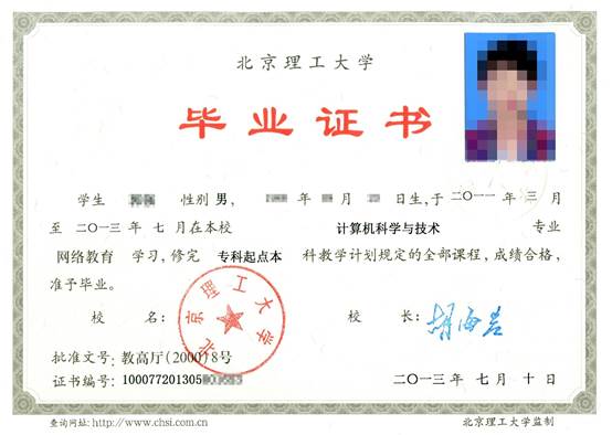1、毕业证:参加专科学习的学生修满教学计划规定的学分并达到最低学习年限,成绩合格,可申请毕业;参加专升本学习的学生在满足上述条件的同时,还要通过两门国家统考课程,方可申请毕业。毕业时发放国民教育系列的标有“网络教育”字样的北京理工大学的毕业证书(样本如图),国家承认学历。所有毕业生按照教育部的规定进行学历电子注册。