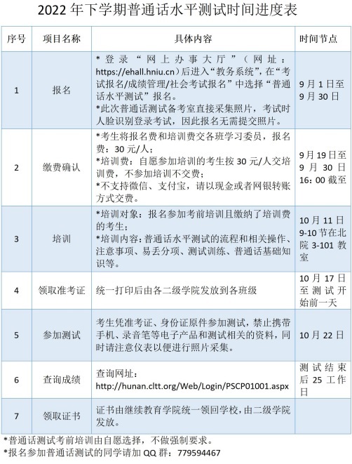 2022年下学期普通话水平测试时间进度表
