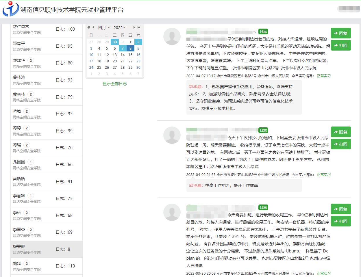 岗位实习、就业指导、辅导员跟踪服务,为毕业生开启“云”端关注每一位学生的健康与顶岗实习情况,每日通过疫情汇报、接龙、在线视频、问卷收集等方式精准、欢乐花式打卡,精准掌握每一位学生的健康状况,督促每一位学生新冠疫苗接种“应接尽接、应快尽快”,共同构筑免疫屏障。每天保持线上就业指导不断线,通过岗位实习云就业平台,结合专业精准的岗位数据分析,实时动态跟踪岗位实习,对每一个学生实习日志进行精准岗位辅导,截至目前完成学院767名顶岗实习学生近16000多次精准顶岗实习指导,确保就业路上“一个都不掉队”。