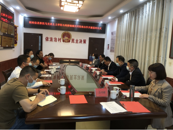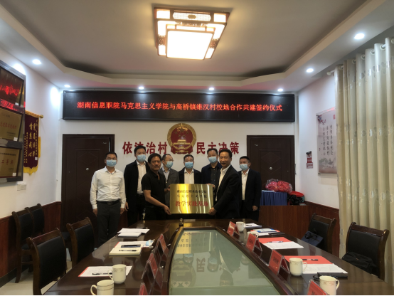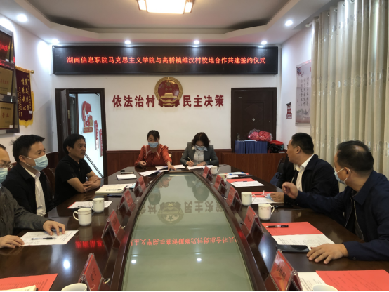 为拓宽思政教学课堂,打造实践教学基地,更好发挥思政课铸魂育人功效,助力乡村振兴战略,10月24日上午,best365官网马克思主义学院与长沙县高桥镇维汉村校地合作共建暨实践教学基地授牌仪式如期举行。学院党委委员、副院长朱焕桃、党委委员、纪委书记姚庆武、马克思主义学院院长谭必翰、副院长罗维根、实践基地负责人王小金副教授等学院相关教师参加,见证实践基地成功签约。长沙县高桥镇党委委员、人大主席胡永俊,高桥镇党委组织委员秦勤,维汉村党总支第一书记、驻村工作队队长梁宇以及维汉村党总支书记皮宗钱、村委会主任李娟等相关合作共建单位负责人参会签约仪式。