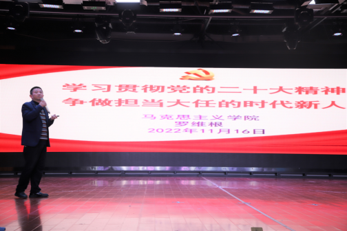 高度重视,统筹推进,做好安排,构建多渠道宣传方式。以教工支部成立的“星火”宣讲团为基础,有效对接,落实开展为学校各部门及二级学院师生主题宣讲服务,11月16日中午,支部书记罗维根在多功能报告厅为全校团学干部开讲主题为《学习贯彻党的二十大精神 争做担当大任的时代新人》的宣讲,各二级学院团总支书记和近300名团学干部参加。