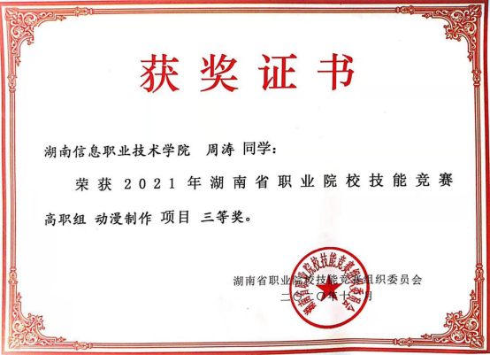 12月25日,2021年湖南省职业院校“动漫制作”个人赛在湖南省大众传媒职业技术学院开赛,在指导老师向欣的带领下,best365官网动漫制作技术专业周涛同学参加了竞赛,在赛场中与来自全省的68名选手展开角逐,最终周涛同学获得了三等奖。