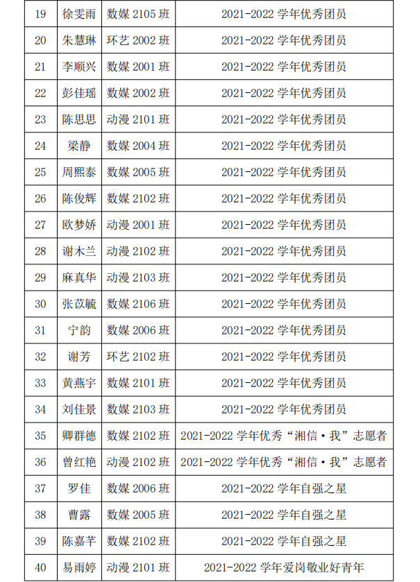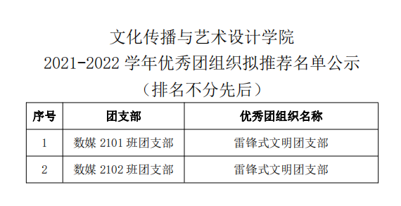 根据《关于围绕党建带团建开展2021-2022学年优秀团组织及个人推树工作的通知》(湘信团发〔2023〕2号)文件要求,本着公平、公开、公正的原则,经各团支部民主评议、团总支推荐、党总支同意,报文化传播与艺术设计学院党政联席会议审核通过,现将2021-2022学年优秀团组织和个人推树名单予以公示,具体情况见附件。
