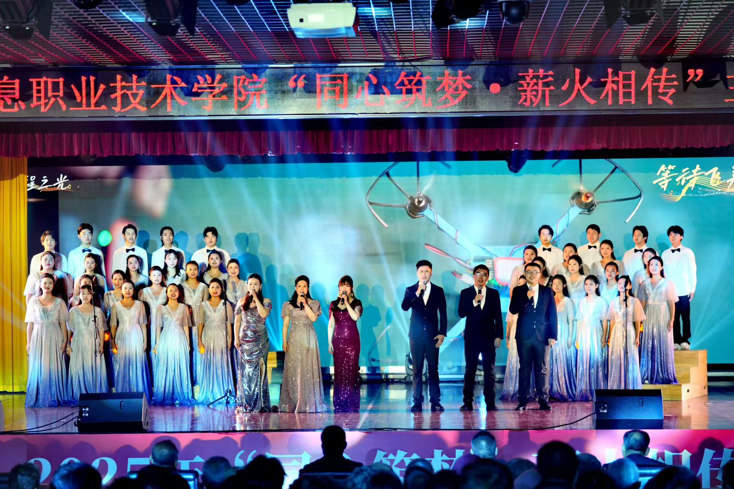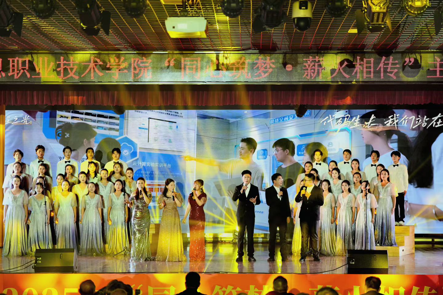 晚会现场灯光璀璨、座无虚席,氛围热烈而庄重。文化传播与艺术设计学院选送的合唱节目《新程之光》《匠心力量》惊艳登场,瞬间将现场氛围推向高潮。师生身着整齐服装,以默契的和声、饱满的情感、挺拔的姿态演绎曲目,每一个音符都饱含匠心传承的坚守,每一段旋律都传递青春奋进的力量,精湛的表演赢得全场师生满堂喝彩,掌声与欢呼声经久不息,成为晚会舞台上一抹亮眼的风景。