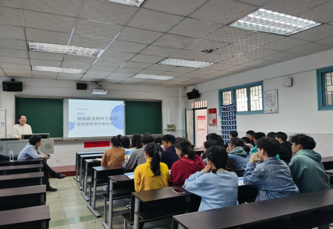 10月11日下午,2021年湖南医沃软件工程师定向培养班开班仪式在3栋教学楼202教室召开。此次定向培养班由网安学院发起,合作方为湖南医沃信息技术有限公司(以下简称医沃),致力于解决19级计应专业就业难的问题。网安学院孙洪琳院长、创业就业干事刘帆、医沃总经理陈伟飞、医沃项目负责人胡志刚列席参与了此次活动。