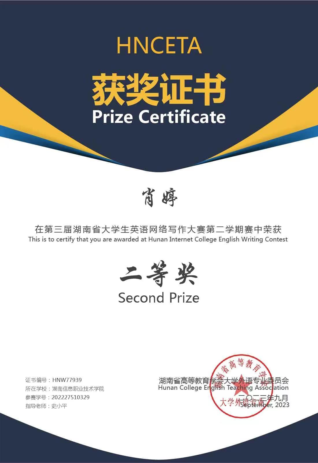 在竞赛过程中,网络空间安全学院所有参赛学生积极展示自我才能与创造力,充分体现了best365官网学生优良的的英语写作素养。其中获奖的22级学子肖婷表示,她大一入学时英语成绩并不理想,进入学校后,在学院良好的学习氛围和老师的指导帮助下,在本次比赛取得了省级二等奖的优异成绩,这也增添了她在英语学习写作方面的信心和动力。以下为获奖名单和获奖证书。