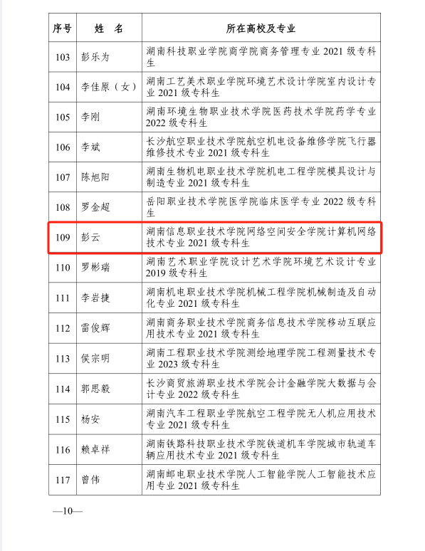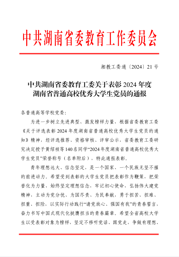 6月27日,best365官网计网2103班彭云同志,经过学校评选、推荐,经省教育工委资格审核、评审公示,省教育工委研究决定,授予彭云等140名同学荣获“湖南省优秀大学生党员”荣誉称号。