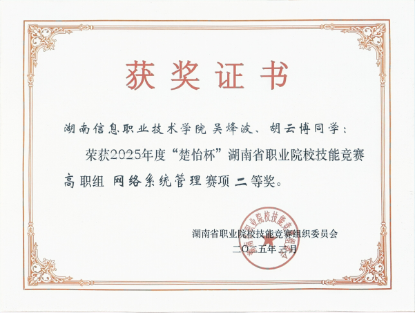 2025年3月19日至21日,湖南省教育厅主办的“楚怡杯”职业技能大赛网络系统管理赛项在长沙民政职业技术学院落幕。湖南信息职院学子在湖南省"楚怡杯"网络系统管理赛项中,由吴烽波、胡云博与陈玄灵、程敏组成的两支队伍,从全省49支劲旅中杀出重围,双双斩获省二等奖。赛事依托企业真实场景,设置网络构建与服务部署双模块,8小时极限考验选手技术应用与实战能力。