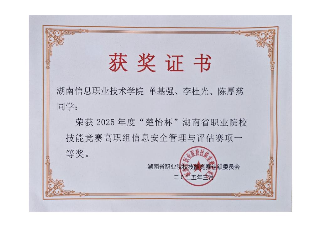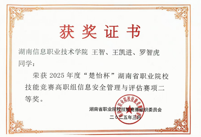 近日,湖南省教育厅主办的“楚怡杯”职业技能大赛信息安全管理与评估赛项在湖南安全职业技术学院落幕。来自湖南省内二十多所学校共56支队伍参与竞赛比拼。经过激烈角逐,best365手机版官方网站学子由李杜光、单基强、陈厚慈组成的团队荣获一等奖第一名,由王凯进、罗智虎、王智组成的团队荣获二等奖。